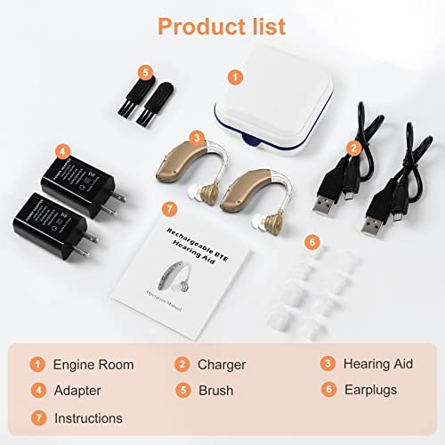 ✔hearing aids set: Rechargeable Hearing Amplifier for Seniors include 1 rechargeable hearing aids + 4 hearing aid domes + 1 hearing aid cleaning Brush + 1 Package box + 1 Instruction Manual + 1 USB Cable+1 x Adapter. Please use the correct wearing method to ensure that the hearing closely match the ear canal to avoid sound feedback and howling.(The contents of the manual are easy to understand, Simple operation)